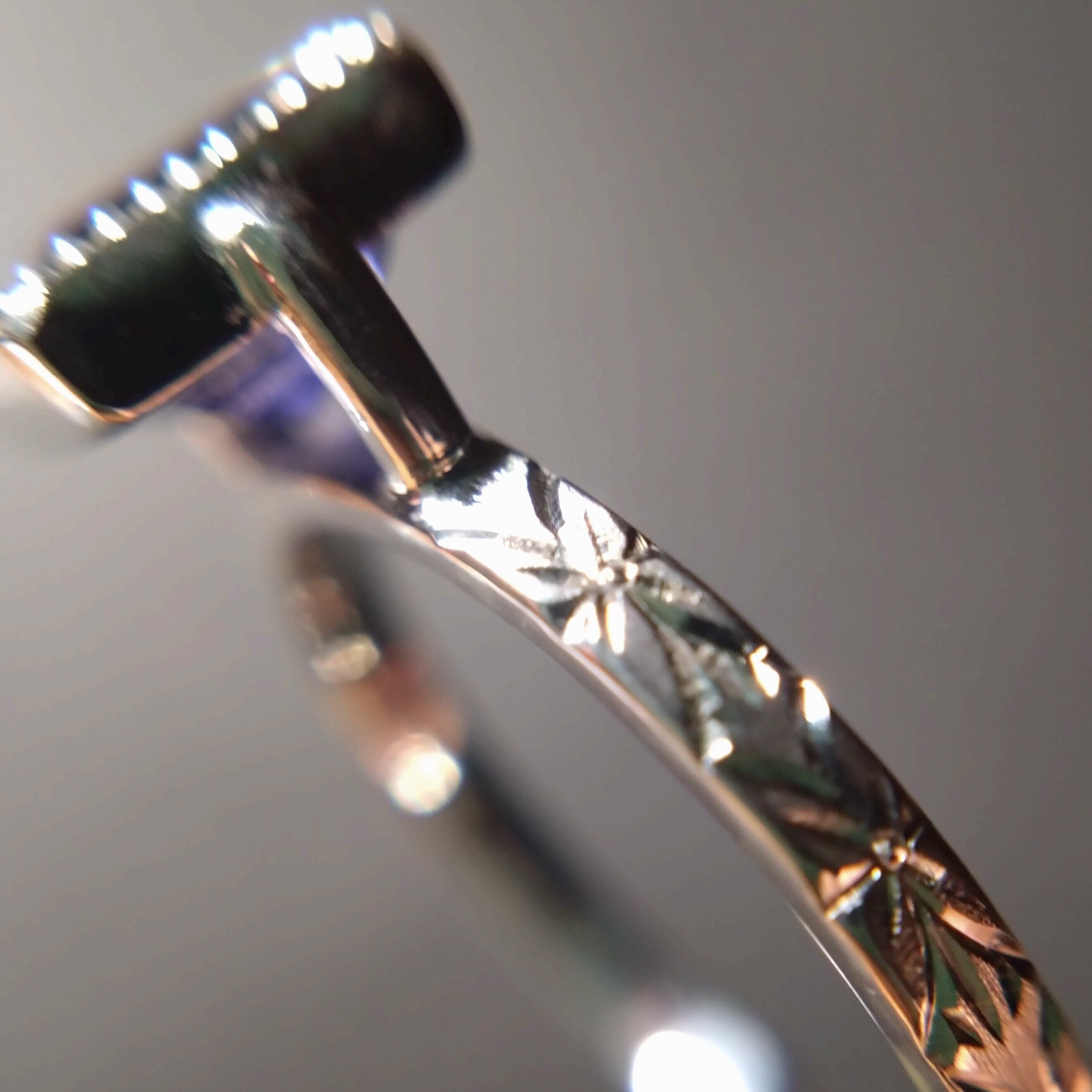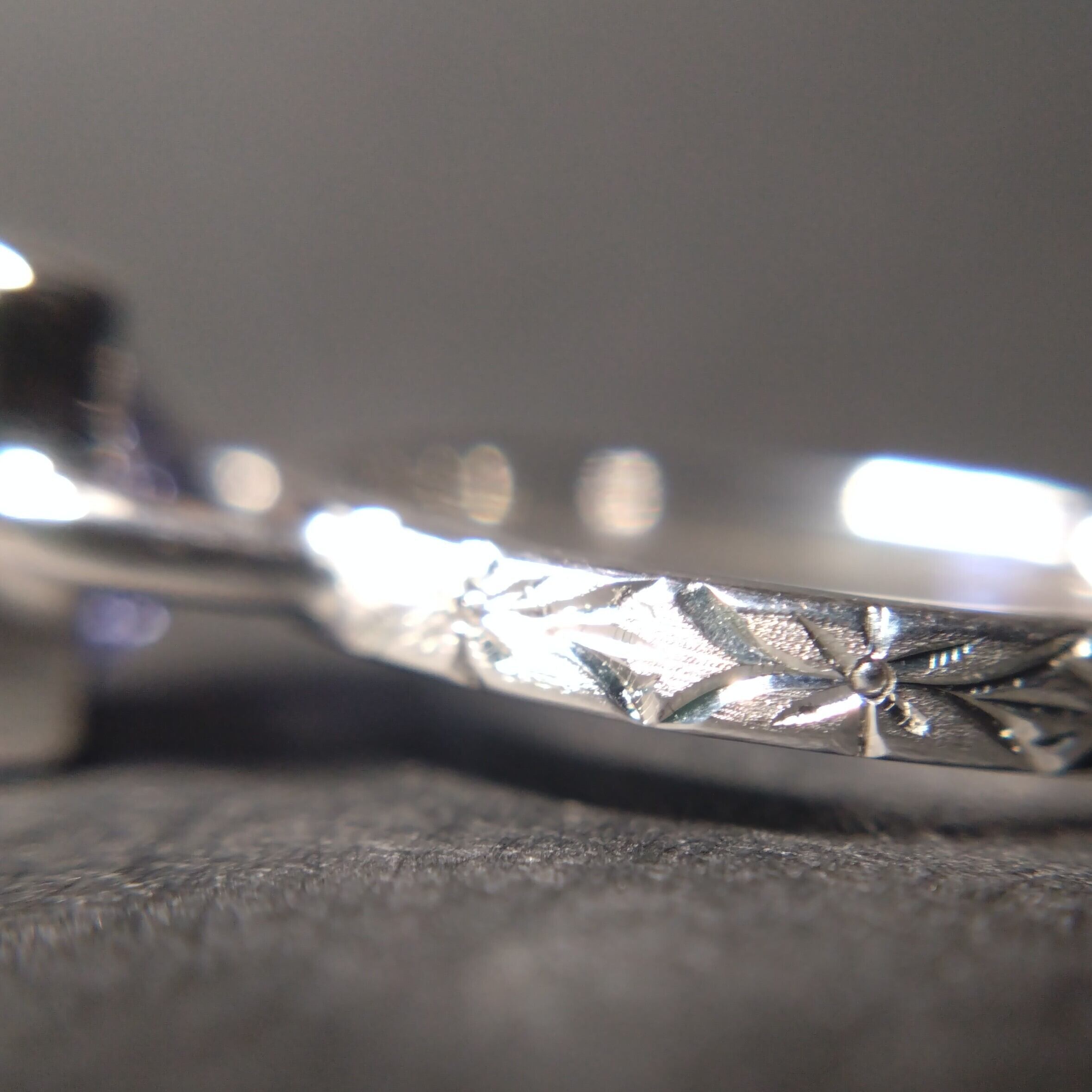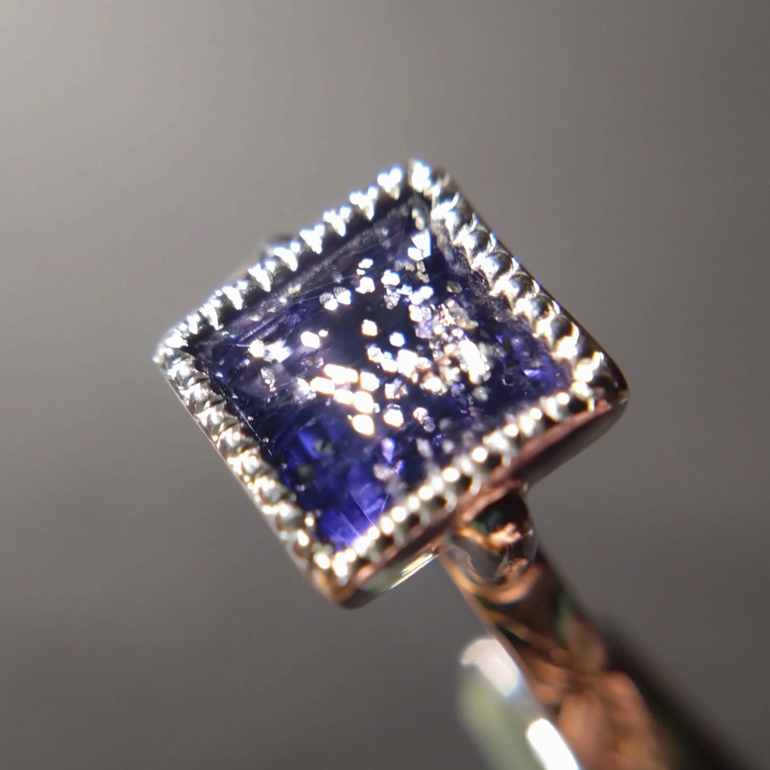 人気のアイオライトに美しいアベンチュレッセンスがプラスされたレアなアイオライトサンストーン。美しいすみれ色の石の中にキラキラと輝く様は夜空をイメージすることでしょう。印象的なスクエアカットが特徴のリングです。石の周りには繊細なミルグレインが施され、アームには手彫りで勿忘草の花のデザインが施されています。シルバー素材で上品な仕上がりになっており、華やかな装いを演出してくれる一品です。
